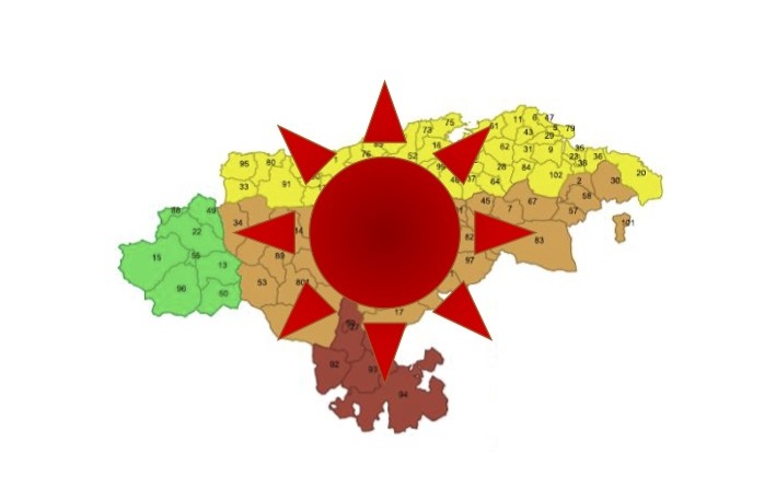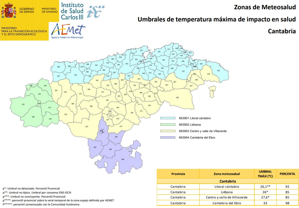 A su vez, la Comunidad Autónoma de Cantabria se divide en cuatro zonas de meteosalud, áreas del territorio que mantienen un comportamiento de temperatura homogéneo (Litoral, Valles interiores, Liébana y Campoo-Los Valles), para cada una de las cuales se determinan umbrales de temperatura máxima de impacto en salud.